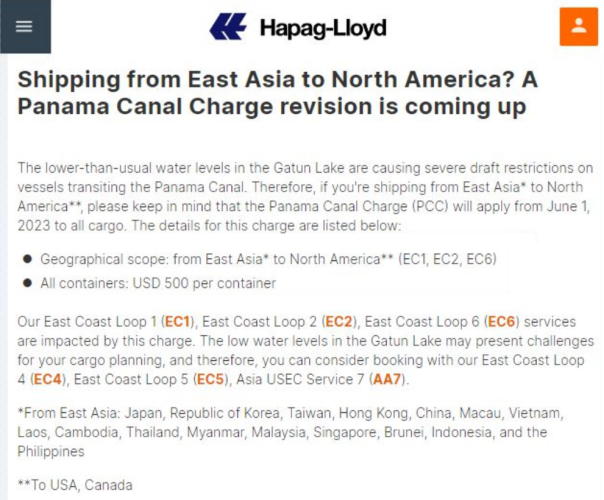 由于干旱問題,加通湖的水位低于正常水平,對通過巴拿馬運河的船只造成了嚴重的吃水限制。為此,赫伯羅特官網(wǎng)發(fā)布通知,從2023年6月1日起,針對從東亞運輸?shù)奖泵赖乃胸浳镎魇? 巴拿馬運河附加費 PCC(PANAMA CANAL CHARGE)。有關收費的詳情如下: