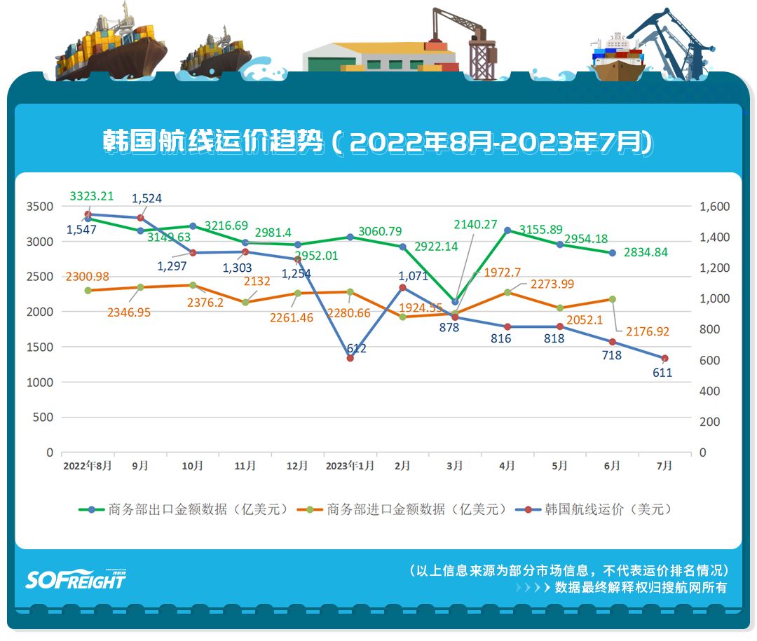 搜航網(wǎng)運(yùn)價(jià)趨勢(shì)以12個(gè)月為觀察周期,選取各船司出口運(yùn)價(jià)平均數(shù)據(jù)、商務(wù)部進(jìn)出口金額數(shù)據(jù),注重呈現(xiàn)整體運(yùn)價(jià)趨勢(shì)變化,建議長期 關(guān)注、收藏 及 分享。
