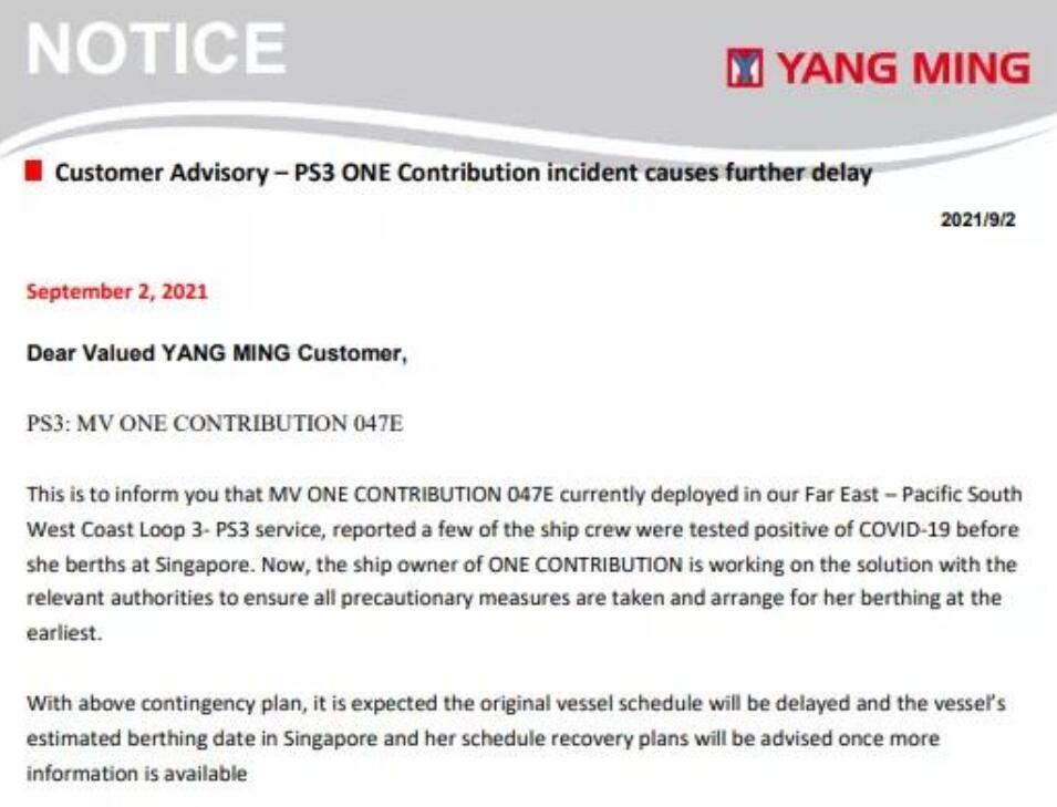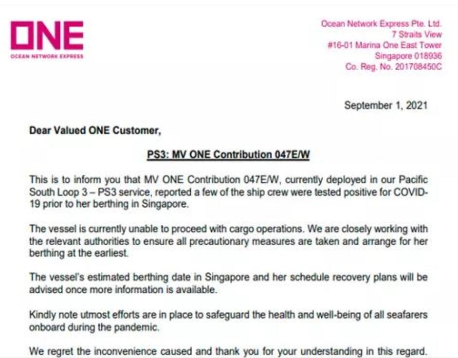 日前,船公司Ocean Network Express(ONE)旗下運營的運力為8560TEU的“ONE Contribution 047E/W”集裝箱船 爆發(fā)新冠疫情,一些船員在即將靠泊新加坡港之前檢測呈陽性,船期將嚴重延誤。