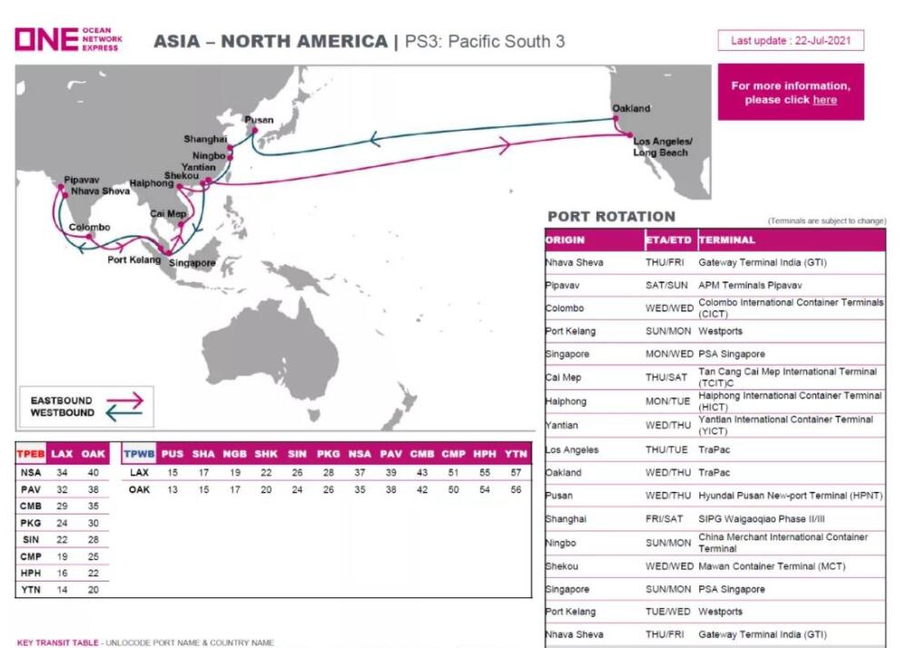 PS3是全新鐘擺式服務,孟加拉的港口提供往返印度次大陸、馬耳他的港口亞洲和美國西海岸的連接。掛靠的港口:Nhava Sheva - Pipavav - Colombo - Port Kelang - Singapore - Cai Mep - Haiphong - Yantian - Los Angeles - Oakland - Pusan - Shanghai - Ningbo - Shekou - Singapore - Port Kelang - Nhava Sheva。