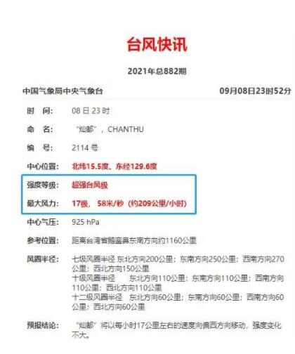 臺(tái)風(fēng)今天最新消息剛剛,今年第14號(hào)臺(tái)風(fēng)“燦都”于7日夜間從強(qiáng)熱帶風(fēng)暴級(jí)快速加強(qiáng)為超強(qiáng)臺(tái)風(fēng)級(jí),8日23時(shí)位于我國臺(tái)灣省鵝鑾鼻東偏南方向約1160公里的洋面上,中心附近最大風(fēng)力有17級(jí)(58米/秒),中心最低氣壓為925百帕,七級(jí)風(fēng)圈半徑150-270公里,十級(jí)風(fēng)圈半徑110公里,十二級(jí)風(fēng)圈半徑60公里。