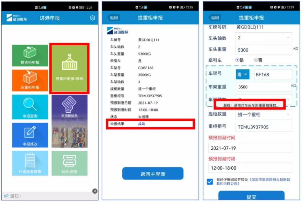 因超載導(dǎo)致申報(bào)不成功,司機(jī)需更換符合配載要求的拖車再進(jìn)行申報(bào)提柜操作。
