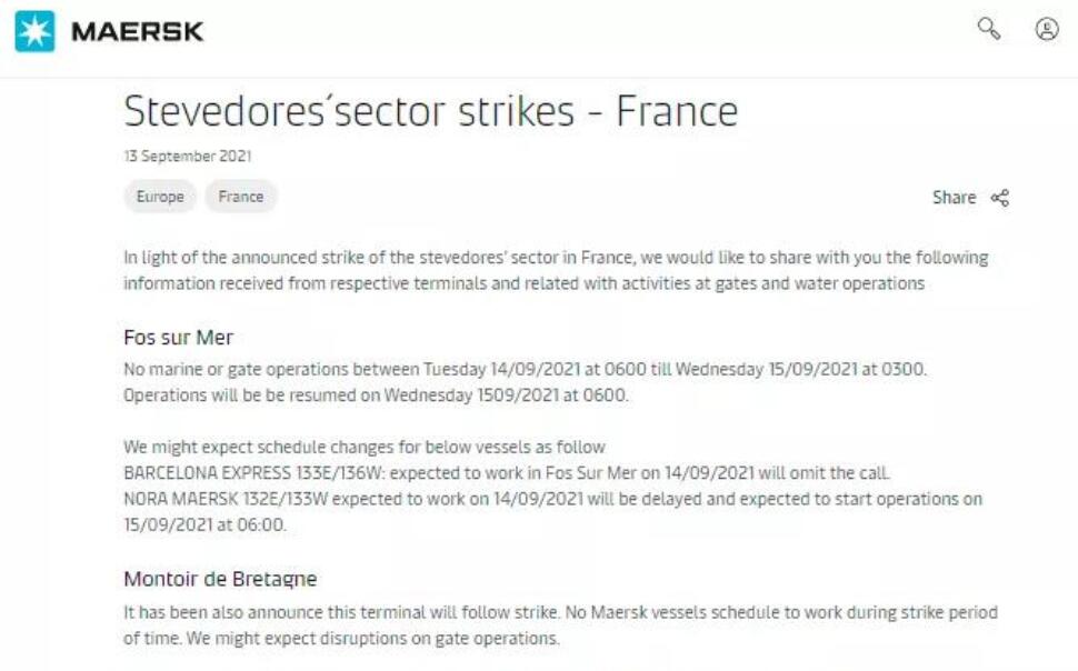 預(yù)計該碼頭在罷工之后,馬士基船舶也將無法作業(yè)。預(yù)計閘口作業(yè)會中斷。