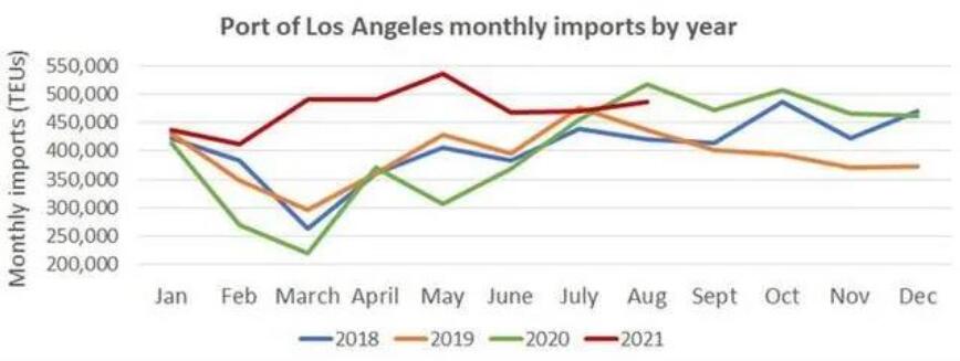 去年8月時,洛杉磯港幾乎沒有船只停泊,而今年8月平均有36艘船只停泊。該港口預計9月和10月吞吐量將分別為93萬TEUs和95萬件TEUs,預計全年吞吐量為1080萬件TEUs。