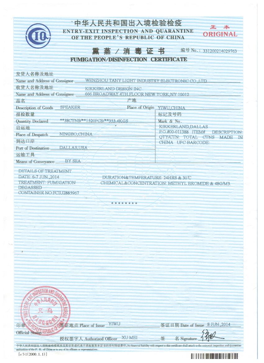 熏蒸商檢證明:格式圖片如下